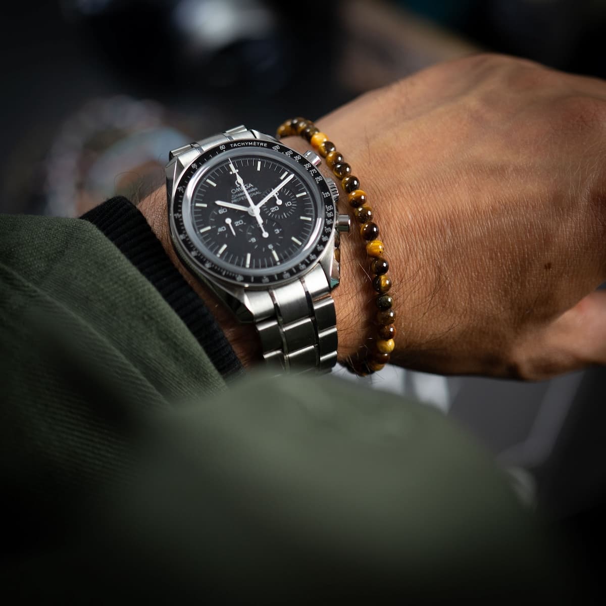 moss agate bracelet with omega speedmaster watch